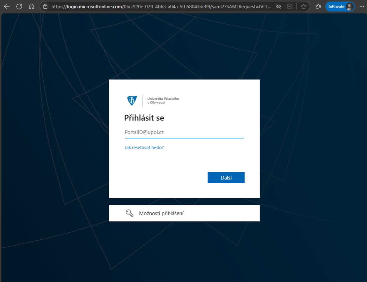 Na první obrazovce vypíše uživatel přihlašovací jméno (tzv. v krátkém tvaru PortalID, ne e-mailovou adresu), nově za něj dopíše ještě @upol.cz, na následující obrazovku pak zadá své aktuální heslo.