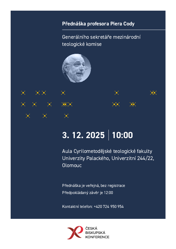 Přednášejícím je Mons. Piero Coda – významný italský teolog, generální sekretář Mezinárodní teologické komise a poradce Generálního sekretariátu synody. Jeho přednáška nese název Třetí fáze synodálního procesu: Realizace a implementace v místních církvích a bude na ni navazovat dialog. Přednášející bude hovořit italsky, tlumočnická služba zajistí simultánní překlad do češtiny.