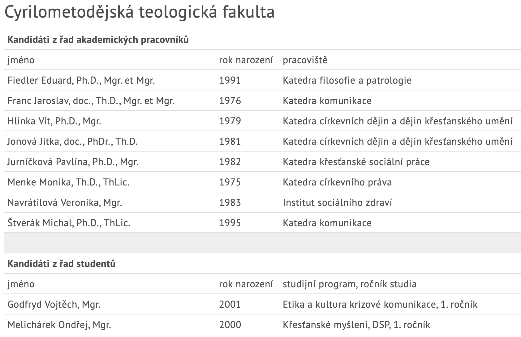 Na kandidátní listině Cyrilometodějské teologické fakulty stojí 8 jmen akademiček a akademiků a 2 jména zástupců studentské obce. Volby do Akademického senátu UP se uskuteční online na volby.upol.cz od 11. do 18. března 2026.